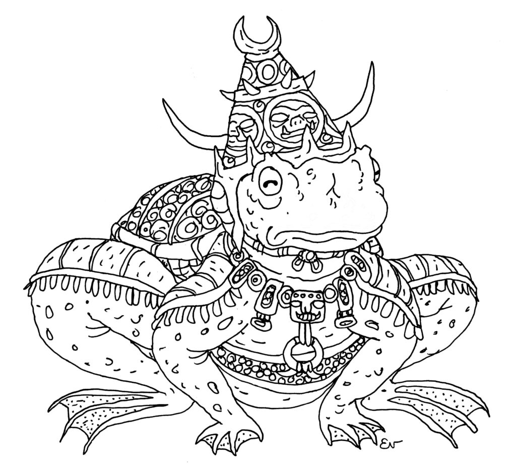 Arguably a minor deity and hotly pursued by its former cultists, this only slightly stolen monstrosity is large enough to carry two riders and strong enough to leap most local chasms. Any time an offensive ranged spell is cast within 60ft of the Jewelled Toad, there’s a 2-in-6 chance that the Toad’s tongue will lash out and snatch it. Fireballs will upset its tummy, stopping it from attempting to eat more magic for the rest of the day.